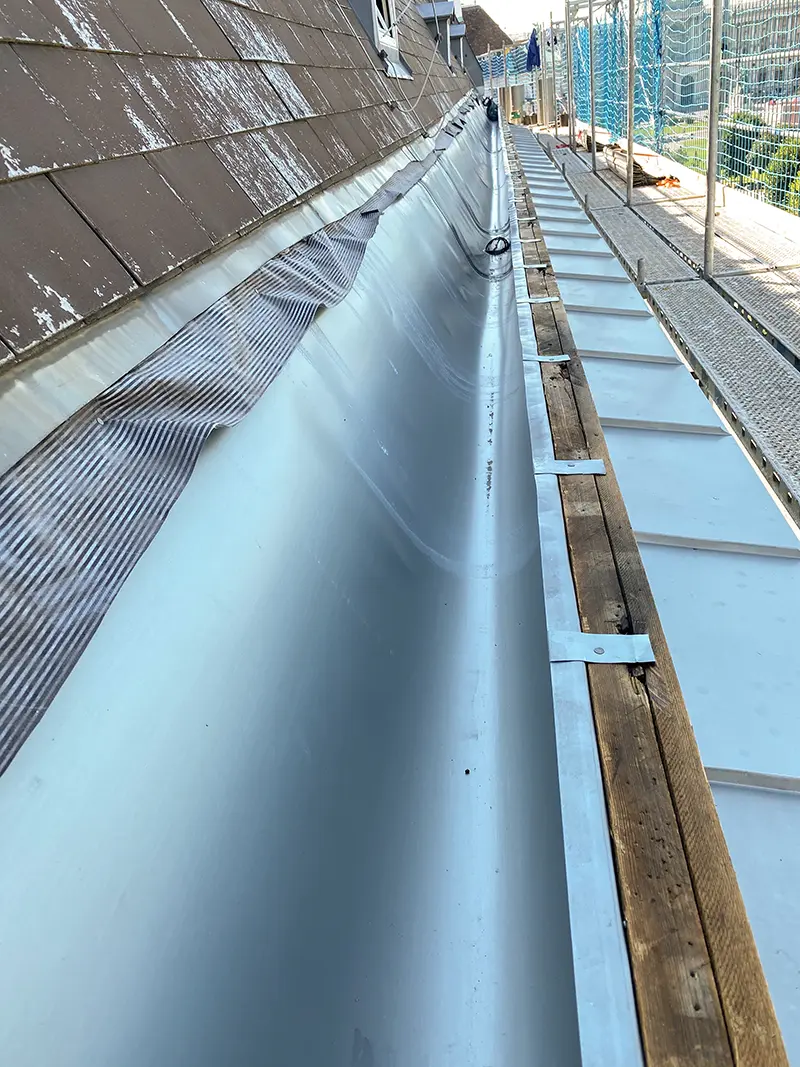Montage einer Einlegerinne aus vorbewittertem Zinkblech (links)